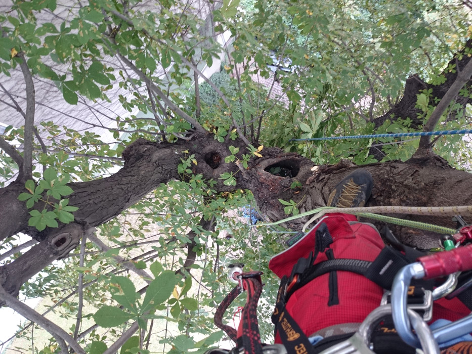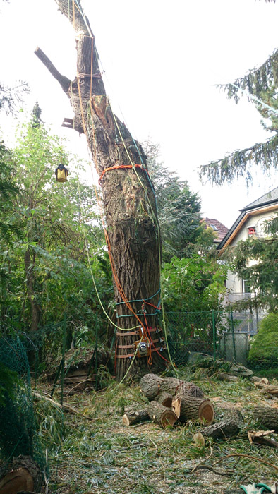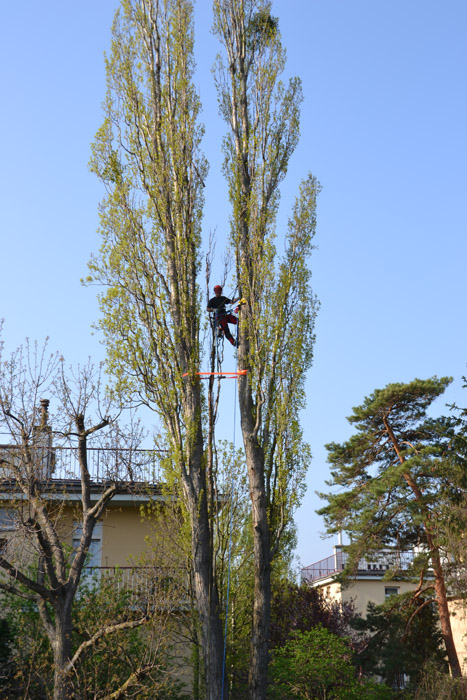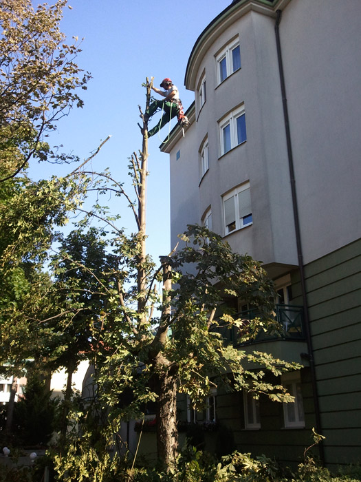 Wir führen den Großteil aller Baumpflegearbeiten mittels Seilklettertechnik durch. Falls notwendig oder sinnvoll, verwenden wir auch Hubarbeitsbühnen unserer Mietpartner.